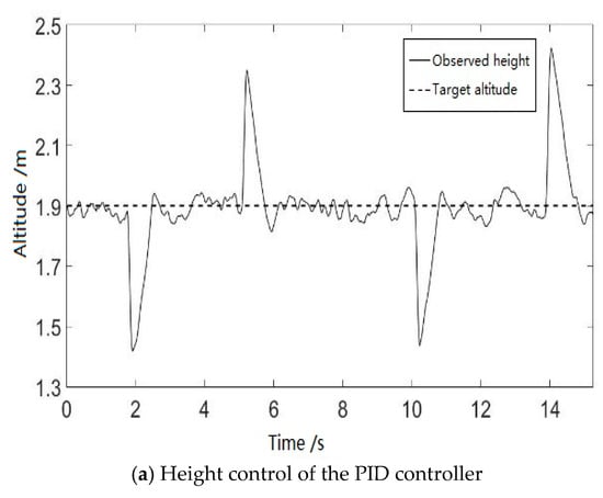 From the comparison of the fixed height flight results in Figure 12a,b, it can be seen that the adjustment time of the cascade PID controller was much less than that of the PID controller in the case of sudden changes of the ground altitude. In addition, the stability of the cascade PID control was better than that of the PID. After considering the statistics of all of the height measurement data, the shortest time from detecting a height change to reaching the desired height was 1.13 s and the longest time was 1.66 s when using the PID controller; when using the cascade PID controller, the shortest time was 0.43 s and the longest time was 0.75 s. The adjustment time of the cascade PID controller improved over 50% than that of the PID controller.