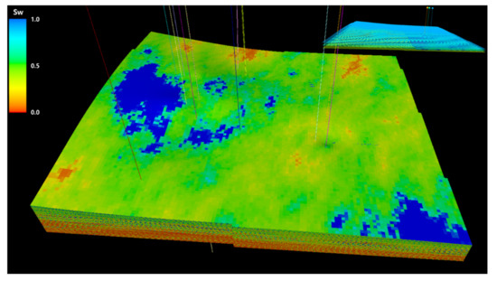 Geology and geophysics model of the Brushy Canyon formation. The color indicates the water saturation distribution.