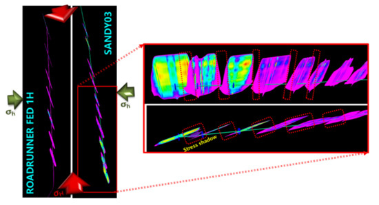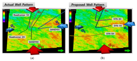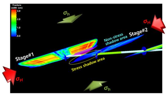 In 2011, studies on the Barnett and Marcellus formations that analyzed the efficiency of hydraulic fracturing according to the drilling azimuth of a horizontal well were published [5,6]. In fact, it was shown that in terms of the efficiency of the hydraulic fracturing treatment (hereinafter described as HFT) method, the more the horizontal wellbore deviated toward the σHmax direction (σHmax-dir), the lower the estimated ultimate recovery (EUR). Then, Yang et al. (2016) conducted a performance comparison study of transversely and longitudinally fractured horizontal wells over varied reservoir permeability [7]. They found that horizontal wells with transverse fractures are preferable over the entire permeability range of their study (50 nD–5 mD) in oil reservoirs. However, the productivity was predicted assuming that the fractures have the same physical properties and were placed either transversely or longitudinally. A hydraulic fracture induces a stress shadow (SS) in the surrounding rock; in turn, the increased stress causes a reduction in width for an adjacent HF that propagates within the stress shadow effect (SSE) region or causes the fracture path to change [8,9,10,11]. Dohmen et al. (2014) used downhole geophones to monitor microseismic events associated with hydraulic fracturing in horizontal wells with different completion stage spacings in the Middle Bakken Play and the Utica Play. They found that hydraulic fractures in closely spaced stages interfere with each other by cyclically bouncing out-of-zone. In addition, the authors attributed the bouncing phenomena to the SSE that accumulated stress forced subsequent fractures preferentially propagate upward, which could have a significant impact on the production-efficient contact area as fractures could be created outside the target production area [12]. Tan et al. (2019) deployed dual microseismic arrays to monitor fracture geometry in Vaca Muerta shale of North America and observed that due to the SSE among neighbor stages, the regional tectonic stress direction before hydraulic fracturing changed and the stress regimes varied between strike-slip and reverse faulting after the stimulation [13].