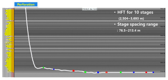 The horizontal wells in the Brushy Canyon formation of our study were drilled in four orthogonal directions regardless of in-situ stress conditions. While two horizontal wells, SANDY01 and Roadrunner Fed 2H, were drilled parallel to σhmin-dir, the other two, SANDY03 and Roadrunner Fed 1H, were drilled perpendicular to σhmin-dir. We implemented this field as “Actual Well Pattern” model as depicted in Figure 3a. On the other hand, the “Proposed Well Pattern” model drilling horizontal wells in consideration of the σHmax-dir was implemented as shown in Figure 3b. In both cases, the total number of fracturing stages was 45 and the total length of lateral parts was set to be 6400 m. The completion of the well was performed based on the completion report at the site, and Figure 4 is the completion design of SANDY03. There are 10 fracturing stages and the spacing between stages is designed to range from 76.5 to 213.4 m. In the case of the proposed model, each horizontal well was designed to have 15 fracturing stages with the same 137.2 m spacing. Then, the pumping design to generate HFs is as shown in Table 2. First, in stage #1, the breakdown linear gel was injected to break the formation, followed by an acid treatment, and the crosslinked gel and proppants were mixed and injected. Then, flushing was followed. This process has become simpler, as the acid treatment and flushing process are omitted in the later stages as shown in Table 2 stage #3.