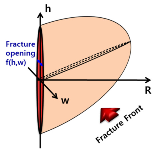 where q is the local flow rate inside the hydraulic fracture along the length, is an average width, is the local height of the fracture occupied by fluid, and is the leak-off volume rate through the wall of the hydraulic fracture into the rock matrix per unit length. Through the Carter’s leak-off model, is yielded by , leak-off height, times velocity, , at which fracturing fluid infiltrates into a surrounding permeable medium.