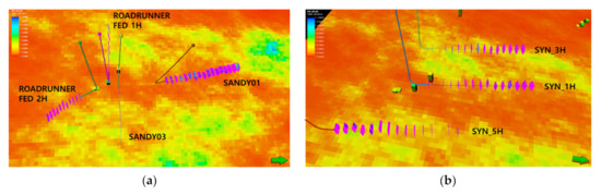 First, as a result of performing HFT on the actual and proposed models, all of the HFs were facing a certain direction, as shown in Figure 7a,b, although the horizontal wells were drilled in four different directions. The σHmax-dir of the reservoir model is N075°E, and all HFs generated in both the actual and the proposed models have grown toward σHmax-dir. In other words, in actual case, transverse (T-dir) fractures were generated in the horizontal wells drilled parallel to σhmin-dir (SANDY01, ROADRUNNER FED 2H), and in the horizontal wells drilled perpendicular to σhmin-dir (SANDY03, ROADRUNNER FED 1H), the HFs formed obliquely and almost longitudinally (L-dir) in the well. Meanwhile, in “Proposed” case, all three horizontal wells were drilled in the σhmin-dir, so that all HFs were formed in the T-dir.