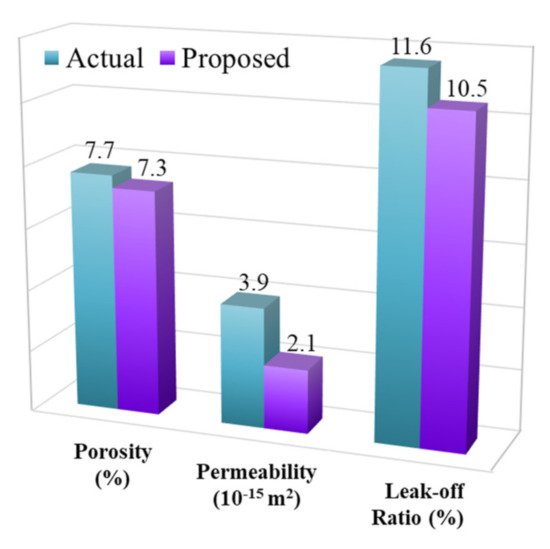 Average porosity (%) and permeability (10−15 m2) of actual and proposed models and their leak-off ratio (%) results.