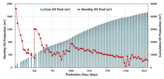 We have calculated the difference between the above T-dir and L-dir HFs induced stimulated reservoir volume (SRV) for each “Well Pattern” model. The concept of SRV provides a link between well productivity, the observed distribution of microseismic events, and HF networks that are created. The SRV dimensions are affected by both reservoir geomechanical properties and hydraulic fracturing parameters [32]. In this study, using the “Kinetix Stimulation” simulator, as shown in Figure 11, the SRV is calculated by creating unstructured grids centered on the HFs and summing the volume of the grids at a certain distance from the HFs [33]. The unstructured gridding created a Voronoi (PEBI; perpendicular bisection) grid which can conform to complex HF geometries generated by UFM [34]. The fracture cell width was upscaled to 3.28 ft. The minimum zone height was 10 ft and layers smaller than 10 ft were merged. As shown in Figure 12a,b and Table 5, the total SRV result of the proposed case, which was designed by considering the in-situ principal stress, was 99,926,737 m3, which was 16.4% higher than the actual case (116,291,809 m3). This is due to the L-dir HFs, which were very closely spaced, formed in SANDY03 and ROADRUNNER 1H of the actual model drilled toward σHmin-dir. Additionally, it is because the fractures created almost parallel to the horizontal well were limited to a narrow range close to the wellbore, so that the contact area to the reservoir could not be formed widely. Figure 13 shows the monthly oil production and cumulative oil production of SANDY03 from 2012 to 2019. The monthly oil production for the 1st year indicates that it decreased to 16.2%, from the initial 1848 m3 to 300 m3. In addition, the cumulative production is only 2.7% (8777.2 m3) of the calculated OOIP. If the T-dir HFs were formed in SANDY03 and the SRV was 16.4% higher, it is expected that 1437.7 m3 of oil can be additionally produced when the oil recovery of 2.7% is incorporated.