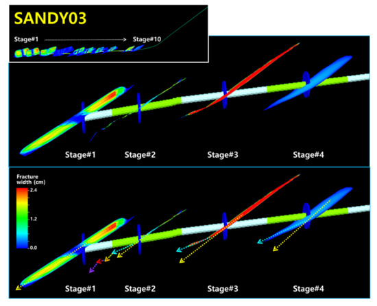 As mentioned earlier, this reservoir model has a very high σHmax/σhmin anisotropy of about 13.8 MPa, and no rotation occurred in the HFs growth direction. However, in the case of a formation with anisotropy of 2.1 MPa, the fracture propagating direction may be affected depending on the magnitude of SSE. To confirm the effect, HFT was performed again in the reservoir with a lower σHmax/σhmin anisotropy of 2.1 MPa for the SANDY03 well where heavy SSE occurred. In the results, as the fracturing stage continued to 2nd, 3rd, and 4th, the change in the propagating direction was confirmed, as shown in Figure 14. As the total stress in the vicinity of the 2nd stage HF increased due to SSE induced by the 1st stage HF, the propagating direction of the 2nd HF was rotated toward the higher stressed zone (yellow arrow to blue arrow in Figure 14); consequently, the HF was formed closer to the horizontal well. It is reported that for fractures not transverse to a horizontal wellbore, the stress interaction between the adjacent fractures may attract and even connect each other [35,36,37]. In other words, depending on the state of principal stresses, HFT could create HFs grown in a direction that is unfavorable for the well productivity, which is L-dir in this study. In particular, when the principal stress anisotropy is relatively small, the HF propagating direction may change due to the occurrence of SSE, and the disadvantage to production may be more severe. Then, the influence of the horizontal well drilling azimuth determination by considering the in-situ stress condition on the efficiency of the HFT becomes more critical.