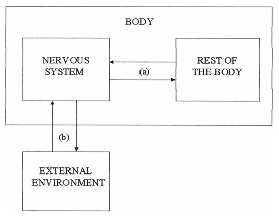 As a physical system the nervous system affects and is affected by two components of the environment that lies outside itself: (a) the environment inside the organism’s body (internal environment) and (b) the environment that lies outside the organism’s body (external environment). Image taken by [37]. ©Taylor & Francis 2004.