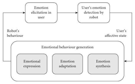 Based on their demonstrated relevance, emotions had a prominent role in social robotics, and they were integrated in humanoids with two different aims: imitating the human empathic interaction and modeling the human mind-body emotion process. In order to establish an empathic connection with its interlocutor—what Paiva calls an affective loop (see Figure 3)—the robot must be equipped with a various range of sensors, particularly for audio-visual perception and an acquiring system capable of recognition and classification of high-level data (e.g., words, facial expressions, gestures). This information is needed by the robot to be constantly aware of the user’s affective state. Likewise, to elicit emotion in the user, the robot should be able to respond accordingly through human-like facial expressions, gestures, and utterances. These aspects of emotion improve the naturalness of the human–robot interaction (e.g., [46,47]) and concern external robotics.