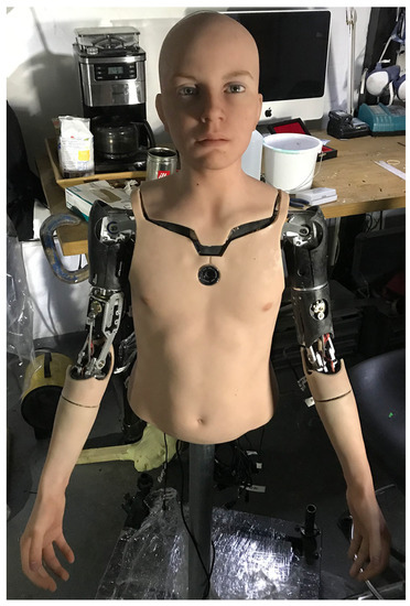 Abel is a new generation humanoid robot, conceived to be a research platform for social interaction, emotion modeling, and studies on embodied intelligence. The name Abel derives from the Hebrew Hevel, or Havel, which means ’breath’, ’vital breath’, or ’vapour’. Its appearance resembles that of an 11–12 year old boy. It is a unique piece, resulting from the collaboration between the Enrico Piaggio Research Center of the University of Pisa [73] and Gustav Hoegen, from Biomimic Studio [74], based in London. Abel is a humanoid resulting from the merge between researchers with bioengineering and robotics background and animatronics artists. The collaboration between engineers and creatives with such an artistic inspiration is fundamental for the creation of a humanoid like Abel, i.e., an emotional robot. Actually, the importance of being emotionally evocative [75] drove the design of the Abel’s body (Figure 4).