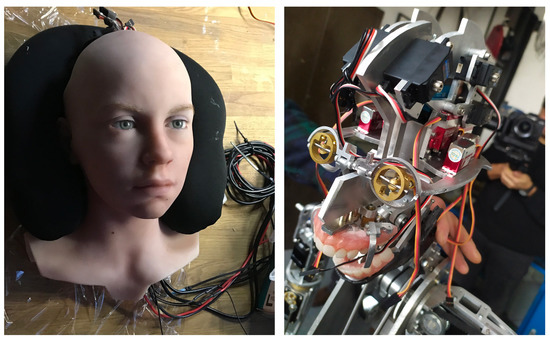 Because of their relevance in generating the illusion of life in the human interlocutor, a particular focus has been given to eyes and mouth movements [76], that have been designed to perform a believable gaze movement, and lip-sync for verbal communication (a detail of Abel’s head mechatronics is shown in Figure 5, on the right).
