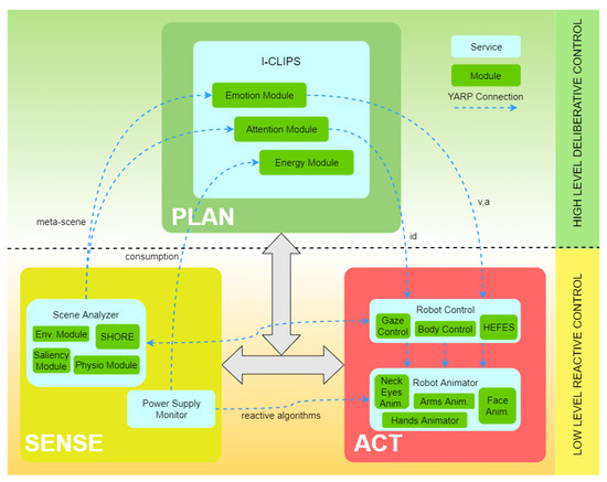 The cognitive system of Abel is an adaptation and extension of SEAI (i.e., Social Emotional Artificial Intelligence), a bioinspired hybrid cognitive architecture we devised and implemented, based on Damasio’s theory of mind and consciousness [77]. SEAI is a modular architecture, conceptually divided in Figure 6 between the characteristic Sense, Plan, and Act functional blocks. Modules are grouped forming services, which are designed as standalone applications. A service can be an application for image analysis, an animator of a robot part, or a component of the cognitive system which is dedicated to the processing of a specific domain of information. These services can be distributed in different computers and the communication among them is implemented with the YARP middleware [78], by which we create a local network dedicated to robot control. The framework allows both low-level reactive control, by means of direct connection between perception and actuation control services and a high-level deliberative control, which includes the possibility to plan context-dependent actions and to perform abstract reasoning on the acquired sensory data by means of symbolic manipulation.