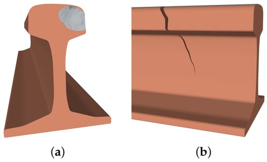 Various classifications of rail defects are adopted in the technical literature. Following Ref. [], a rail track defect could be either of geometry or structural type. Track geometry defects are related to the geometric conditions of tracks; track structural defects, instead, refer to ill-conditioned structural parameters of tracks (including rails []). In the remaining part of this paragraph, we take into consideration track structural defects only; these are divided into the three broad categories described below.