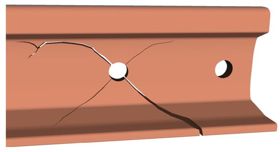 Rail manufacturing defects usually comprise inclusions or incorrect local mixings in rail steel; these generate localized stresses under operative load, which, in turn, can trigger a rail failure process [,]. Damages of this category include transverse defects (TD) and longitudinal defects (LD) [,,]. The former type of defects consists of a progressive fracture developing in the railhead parallel to the transverse direction [] (see Figure 2); the latter type, instead, is represented by an internal progressive fracture propagating longitudinally in rails. Longitudinal defects can be further subdivided into vertical and horizontal split heads (see Figure 3).