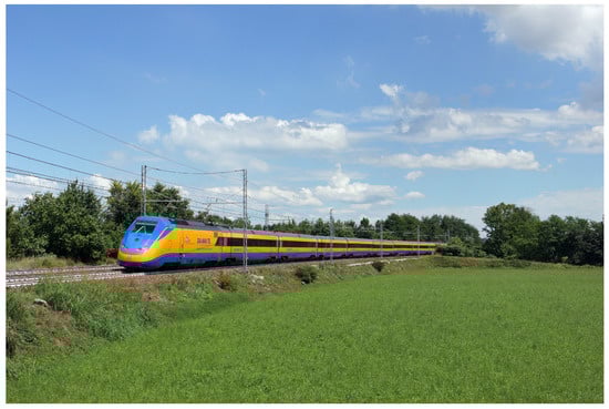 Visual inspection can be exploited by a human expert walking on tracks and searching for defects, or by automated techniques. Automated visual inspection is based on video cameras, optical sensors, and custom-designed algorithms to analyze the rail surface as the diagnostic train rides over [,,,]. Test speeds can be as high as the velocity of high-speed trains [], but only the visible surface of the rail is inspected and internal defects cannot be detected []. Furthermore, since detection performance is influenced by lighting conditions, proper countermeasures need to be adopted []. An example of a high-speed diagnostic train also making use of visual inspection techniques is shown in Figure 8 [].