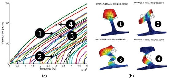 As it can be easily inferred from the dispersion curves shown in Figure 10a, various propagating modes can be excited in rails in the frequency range of interest (25 kHz–45 kHz). However, not all of these modes are suitable for long-range propagation due to the attenuation they experience (e.g., in the foot of the rail) or their high dispersivity [].