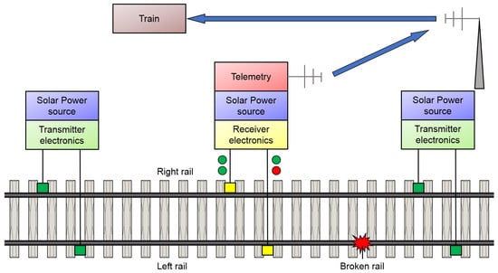 The UBRD is a broken rail detection (BRD) system, designed to continuously detect full breaks in rails []. Its transducers are tied to the rail and allow for monitoring a span of up to 1 km of track in pitch–catch mode. This system has been already installed on 841 km of tracks in the high-haul Oreline network in South Africa [,]. The system architecture is represented in Figure 11; its operation is based on a simple transmit–receive confirmation protocol. As long as a reliable reception of the ultrasonic signal generated by the transmitter is possible, the integrity of the rail is verified; otherwise, an alarm is set [,].