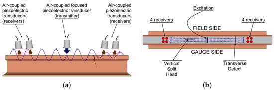 Schematic of the non-contact defect detection system based on ultrasonic guided waves: (a) side view and (b) top view. The two red lines indicate the possible locations of a vertical split head and a transverse defect [].