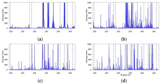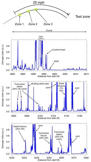- An active rail inspection system is able to detect surface-breaking cracks and internal defects located in the railhead. It is based on UGWs and air-coupled contactless probing. Both the transmission of test signals and their reception are accomplished by means of air-coupled piezoelectric transducers arranged in a pitch–catch configuration. The use of a laser transmitter has been also investigated []; however, this option has been judged too costly and is potentially hard to maintain. In an active system, receivers are arranged in pairs and placed at the two sides of the transmitter: this allows for implementing a differential detection scheme. The system output, after data analysis, is represented by the so-called damage index (DI), exhibiting peaks in correspondence of discontinuities (i.e., of potential defects) in rails. In recent years, the use of laser technology for both exciting UGWs in rails and sensing them has been investigated [,]. In this case, non-ablative laser sources are used to generate a guided tensional wave system in the rail; the response to such a system can be sensed by means of a rotational laser vibrometer.