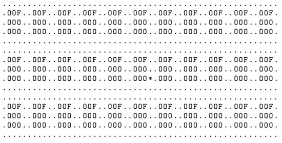 There are three types of objects available-food (“F”), rock (“O”), and empty cell (“.”). In each trial, the agent (“*”) is placed randomly on an empty cell and can sense the environment by analyzing the eight nearest cells. Two versions of encoding are possible. Using binary encoding, each cell type is assigned two bits, so the observation vector has the length of 16 elements. On the other hand, using an encoding with the alphabet , the observation vector is compacted to the length of 8.