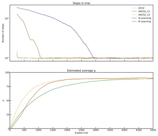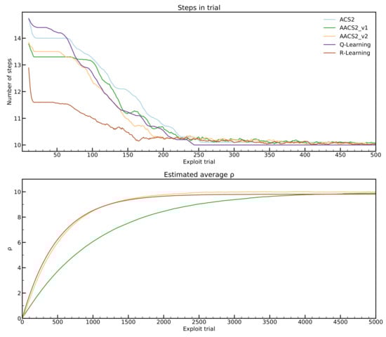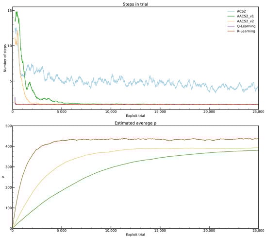 Figure 10 shows that the ACS2 did not manage to learn the environment successfully—the number of steps performed in the exploit trial is not stable and varies much higher than the optimal value. On the other hand, both AACS2 versions managed to function better. The AACS2-v2 stabilizes faster and with weaker fluctuations. The best performance was obtained for the Q-Learning and R-Learning algorithm that managed to learn the environment in less than 1000 trials. The average estimate value converges at the value of 385 for both cases after 50,000 trials, which is still not optimal.