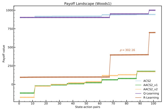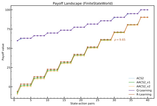 Figure 7 depicts the differences in the payoff-landscapes. The relative distance between adjacent state–action pairs can be divided into three groups. The first one relates to the discounted reward agents (ACS2, Q-Learning). Both generate almost a similar reward payoff for each state–action. Later, there is the R-Learning algorithm, which estimates the value and separates states evenly. Furthermore, two AACS2 agents are performing very similarly. The value calculated by the R-Learning algorithm is lower than the average estimation by the AACS2 algorithm.
