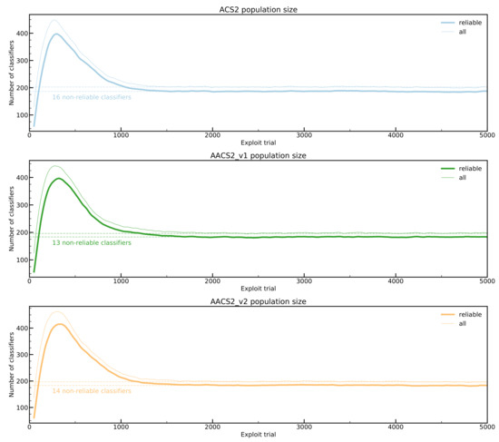 What is interesting is that neither ACS2 nor AACS2 population settled to the final size. Figure 11 demonstrates the difference in size for each algorithm between total population size and the number of reliable classifiers. Even though the algorithm manages to find the shortest path for AACS2, the number of created rules is greater than all unique state–action pairs in the environment, which is 101. The experiment was also performed ten times longer (one million trials) to see if the correct rules will be discovered, but that did not happen.