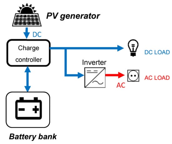 Renewable electricity generation is widely used in rural areas where the electrical grid is weak or nonexistent. Stand-alone (off-grid) systems are typically powered by a photovoltaic (PV) generator with battery storage. In this kind of system, the battery technology most widely used is lead-acid. In some cases, a hybrid PV–fossil fuel generator (diesel or gasoline)–battery storage system can be optimal—that is, the system with lower costs during the system’s lifetime. Standalone systems can be direct current (DC) or altern current (AC) coupled [1]—that is, the bus where components are connected can be the DC bus or the AC bus. DC coupled systems (Figure 1) are usual in low power systems (typically lower than 5 kW), while the AC-coupled system is commonly used in larger systems. The charge controller is needed to avoid overcharge and over-discharge of the battery, preventing premature failure. Additionally, an inverter (DC/AC) is needed when there is AC load.