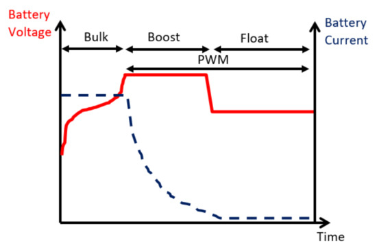 It prevents overcharge and over-discharge of the battery. In lead-acid batteries, overcharge is avoided by charging batteries in three stages (bulk, absorption, or boost and float stages, Figure 2). Absorption includes battery equalization in some cycles, periodically. During the second and third stages, the current is limited using the pulse with modulation (PWM) technique. The limits between stages are voltage setpoints, while advanced controllers compare the minimum battery state of charge (SOC) of the previous discharge with SOC setpoints to determine the charge stages to be applied. In this work, SOC controllers performed the boosting stage if the SOC during the last discharge was lower than a specific value (usually 70%), and equalization was performed if battery SOC during discharge was lower than another specific value (usually 40%).
