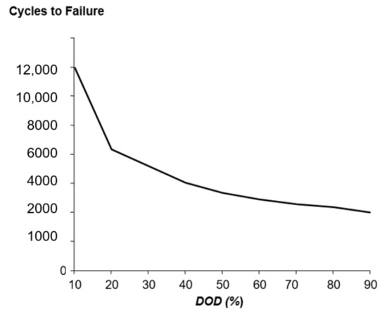 Lead-acid battery: cycles to failure vs. depth of discharge (DOD) [48].