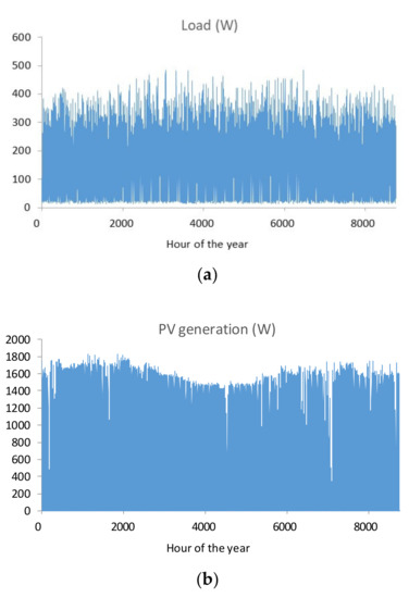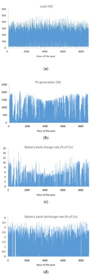 Table 3 shows the results of the simulation during a whole year for the two locations considered. It can be seen that the battery bank charge/discharge energy is very low (roughly 700 kWh/yr), which implies around 60 equivalent full cycles. The charge/discharge rates are very low, as is usual in PV-battery stand-alone systems: the average charge rate is roughly 4% of the battery’s nominal capacity, while the average discharge rate is around 1%.