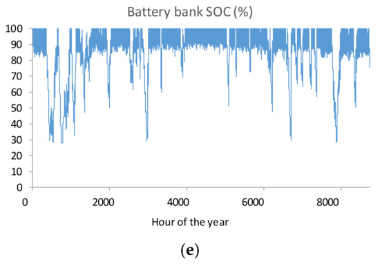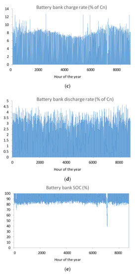 Hourly simulation of the Pyrenees—lead-acid battery: load (W) (a), PV generation (W) (b), battery bank discharge rate (% of Cn) (c), charge rate (% of Cn) (d) and state of charge (SOC) (%) (e).
