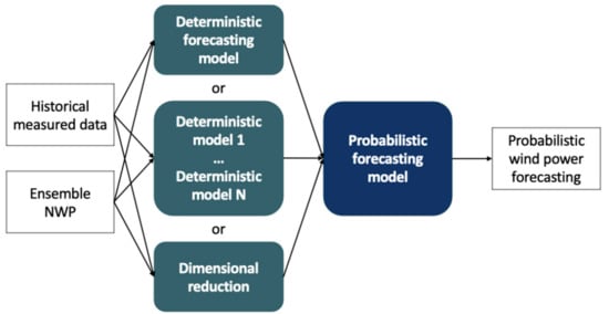 Many forecasting approaches with ensemble NWPs have been utilized to provide the probability of wind uncertainties. A typical ensemble NWP model may include a unique conversion model, multi-conversion forecasting model, or dimensional reduction model, as shown in Figure 2.