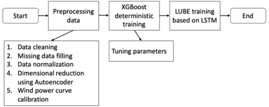 Figure 7 shows the proposed 3 h-ahead probabilistic wind power forecasting model. There are three main processes: preprocessing of dataset, deterministic wind power forecasting using XGBoost, and probabilistic wind power forecasting based on LUBE-LSTM (Lower Upper Bound Estimations–Long Short-Term Memory) model. The LUBE method was selected because it is advantageous to wind power forecasting; several previous studies [5,6,27] have verified its effectiveness on forecasts. LUBE can be directly constructed using the LSTM model, enabling predictors to select more input variables and generate two outputs (lower and upper bounds). For probabilistic forecasts, lower bound and upper bound are significant to build PIs.