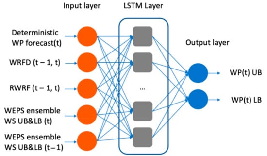 Additionally, this work develops a hybrid model for probabilistic wind power forecasting. It considers different NWP data, dimensional reduction for ensemble NWPs, and XGBoost. The forecasting module, i.e., prediction interval, in this work uses lower upper bound estimation based on Long Short-Term Memory (LSTM) [16,17,18]. According to the forecasting results, the proposed forecasting model outperforms traditional models in term of accuracy and reliability.