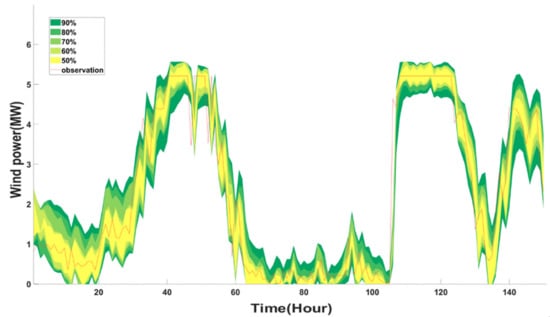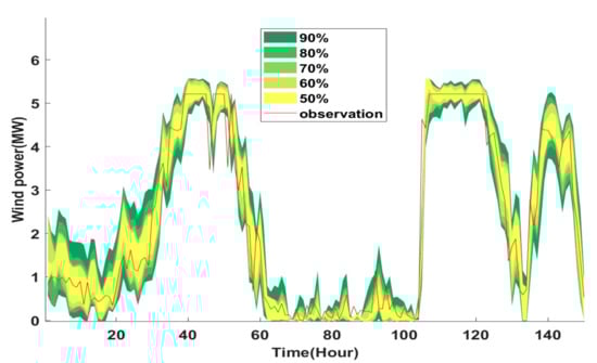 where yt, Lt, and Ut are the observation value, the lower bound, and the upper bound, respectively, with the same number of timestep t. A confidence level refers to the percentage of all possible samples that can be expected to include the real population parameter. For example, a 50% confidence level implies that 50% of the confidence intervals would include the real population parameter. Generally, PICP must be close to the confidence level that is predetermined in the probabilistic model.