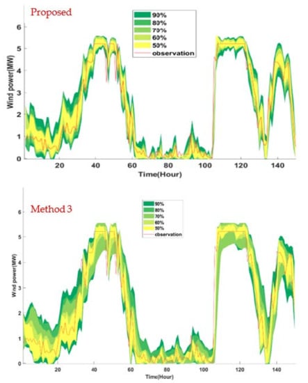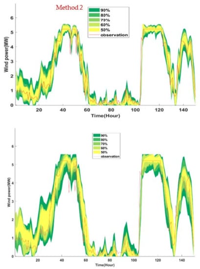 Figure 12, Figure 13 and Figure 14 present the results of probabilistic forecasting for the Hu-Si wind farm in the prediction intervals from 50 to 90% considering different NWP models as Method 1. Figure 15 and Figure 16 display the comparison of wind power forecasts by the proposed model with Method 2 and Method 3, respectively. To examine the accuracy of PIs (PI validity) and demonstrate the efficiency of the proposed method (method performance), Table 3, Table 4, Table 5, Table 6 and Table 7 summarize the values of PICP, PINAW, and CWC, respectively.