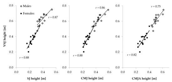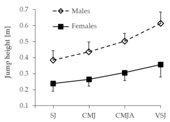 Differences in jump height were also found between sexes during all four jump types. Jump performance differences between sexes were previously reported in volleyball players during SJ [19], CMJ [19], and VSJ [6]. The reasons may include biological and power differences [20,21], the ability to benefit from stretch-shortening-cycles [19,22], and technical-coordinative variations [6]. These sex differences support sex-specific assessment of jump performances. Moreover, ANOVA results revealed an interaction (sex by jump type) for jump height, indicating that differences in height between jump types vary for females and males. Therefore, sex-specific analyses of jump performance are highly recommended, especially for predictions of VSJ height based on general jump type performances.