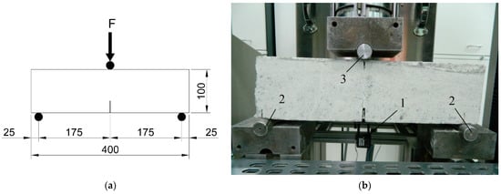 For laboratory research, the “Toni Technik ToniPRAX” testing machine (Toni Technik Gmbh, Berlin, Germany) was used, which implements uniaxial compression of the specimens with a maximum force of 3000 kN and three-point bending of the specimen with a maximum force of 100 kN. The testing machine must operate in a loading-controlled mode during compressive strength tests and in a displacement-controlled mode during CMOD tests.