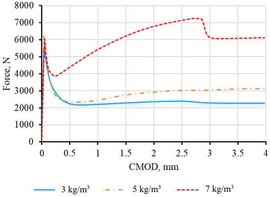 Force versus CMOD from the bending test conducted on the specimen in a form of a beam reinforced by different macrofiber mass amount.