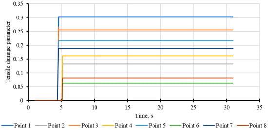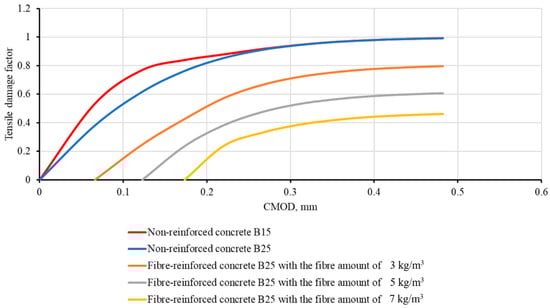 The diagrams in the axes “tensile damage parameter versus CMOD” based on experimental data of CMOD tests are shown in Figure 4. These diagrams are directly used by the concrete damaged plasticity model as additional parameters to correctly simulate the accumulation of damage in concrete.