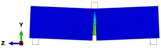 The numerical model of concrete under bending (see Figure 6) consists of three separate parts (a concrete beam, two supporting bars and a loading bar). Interaction among parts is carried out through special contact conditions—“hard” contact with friction penalty. A concrete beam is modeled by solid deformable finite elements and it consisted of about 1600 hexagon finite elements of second geometric order. The supporting and loading bars are modeled by finite elements describing an absolutely rigid body.