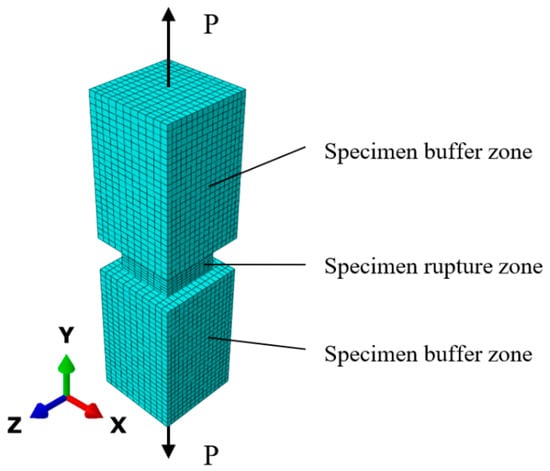 The numerical model for testing concrete under uniaxial tension is shown in Figure 8. The following dimensions of the specimen were used during the simulation: 15 × 15 × 55 cm with a weakening area of 10 × 10 × 6 cm at the center. Attenuation in conditions of homogenous uniaxial tension is necessary to localize plastic deformations in a certain area to track the width of the crack opening as well as to specify the area of plastic deformations and accumulation of damage in concrete in an obvious form. In real tests, conventional prism specimens with a cross-sectional area of 10 × 10 mm were used.