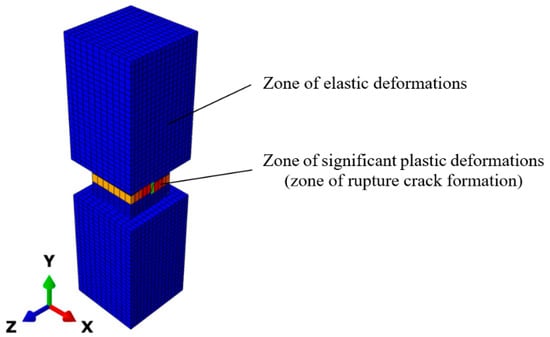 The numerical simulation was performed in the framework of setting a plane strain in the Simulia Abaqus software package. The general design scheme included in the model is shown in Figure 11.