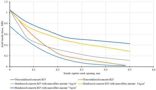 Based on the test results the diagrams were performed in the axes “axial stress” and “tensile rupture crack opening.” These diagrams are shown in Figure 10. They are used as a basis for obtaining the diagrams shown in Figure 4.