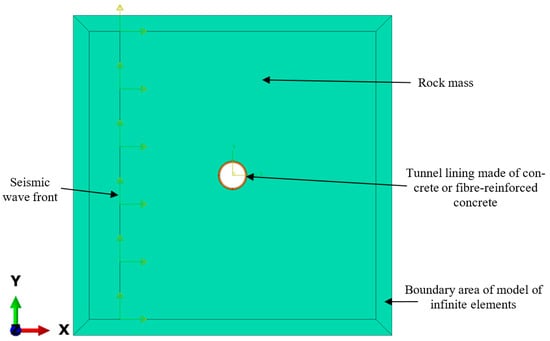 Calculations on the numerical model were implemented in two stages. Simulation of geostatic loading formation in the tunnel lining from the self-weight of the host rock mass was performed in Stage-1. In Stage-2, the simulation of a seismic impact propagating as a wave disturbance through the calculated area of the rock mass was performed.
