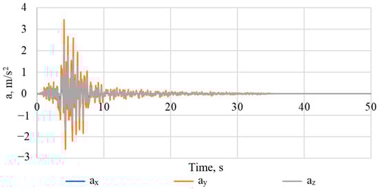 The seismic impact was modeled by applying forced accelerations on the inner face of the model, set component-by-component for the directions of the axes of the coordinate system. The accelerogram of a real earthquake that occurred in Friuli in 1976 shows a magnitude of about 6.5. The component-by-component decomposition of this accelerogram is shown in Figure 12.