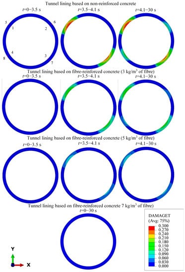The calculated zones of material damage of the tunnel lining under seismic impact at different time intervals are shown in Figure 13, provided that the tunnel lining is made of non-reinforced monolithic concrete or from fiber-reinforced concrete with a polypropylene macrofiber amount of 3, 5 and 7 kg/m3. The quantitative damage indicator shows how much of the initial strength and stiffness is lost by concrete in the current time interval due to the crack development.