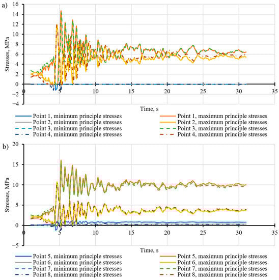 Curves of the maximum and minimum principal stresses in the tunnel lining made of non-reinforced concrete under seismic load for the points of the inner contour (a) and the outer contour (b).