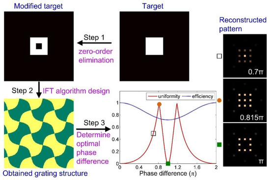 Our novel idea of the non 0-π DOE design is based on such special properties of the 0-π DOE. The detailed design process can be divided into three steps as shown in Figure 2. To begin with, the zero order of the target pattern is set to zero, resulting in a modified target pattern. Thereafter, the modified IFTA named three-step iterative soft quantization algorithm proposed by Wyrowski [26,27,28] is taken to design the 0-π DOE for this modified pattern. By iteratively applying the two-dimensional Fourier transform and inverse Fourier transform, and setting constrains at the DOE plane and output plane, the phase-only distribution can be obtained. In the DOE plane, the amplitude is removed and the phase is quantized progressively. In the output plane, the region of desired orders is defined as the signal window and the rest as the noise window. In the iteration, the complex amplitude in the noise area and the phase in the signal area are not constrained, which are referred to as amplitude freedom and phase freedom, respectively. Only the amplitude in the signal area is replaced by the target distribution multiplied by a scale factor, which is used to adjust the power repartition between the signal and noise areas. A more detailed flowchart can be found in [28]. When the iteration is terminated, phase distribution of the DOE can be obtained. As mentioned before, changing the phase difference of the 0-π DOE can enhance the zero-order intensity while maintaining the uniformity of other diffraction orders. Therefore, in the last step, we keep the phase distribution unchanged, then vary the phase difference from 0 to 2π, and calculate the corresponding output light field. For each value, the corresponding output light field is calculated with two-dimensional Fourier transform operation and the diffraction efficiency and uniformity are evaluated and plotted with respect to the phase difference. Finally, the optimal phase difference can be found intuitively from the curve. Diffraction efficiency η and uniformity σ are defined as follows: