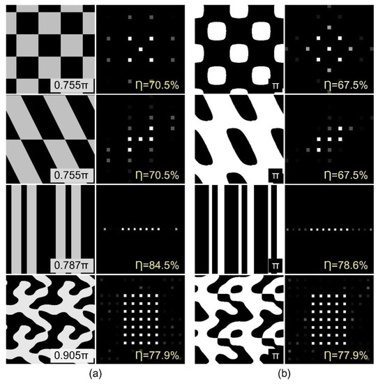 A design example of a 3 × 3 beam splitter is also given in Figure 2. The lower left corner is the phase distribution of the 0-π DOE designed for the zero-order eliminated target pattern. The lower right corner shows the variation of the diffraction efficiency and uniformity with respect to the phase difference. The whole curve is symmetrically distributed because the symmetry of the Fourier transform for φ and 2π-φ phases. Thereby, it is only necessary to search for the optimal phase difference between 0 and π. It can be seen from the figure that as the phase difference decreases from π to zero, the uniformity first increases and then decreases. This is because when the phase difference deviates from π, the zero-order light intensity is gradually increased and consequently the uniformity gets better. Thereafter, as the phase difference is further reduced, zero-order intensity is gradually greater than other orders and therefore the uniformity is weakened. The reconstructed patterns corresponding to the phase difference of 0.7π, 0.815π, and π are also presented in Figure 2. The efficiency curve shows that the overall diffraction efficiency always increased with the phase difference decreases. This was mainly due to the increase in zero-order efficiency. Ultimately, when the phase difference was equal to 0.815π, the uniformity reached a maximum of 99% and the corresponding diffraction efficiency was 74%. This design result is comparable to the one in [22]. However, the proposed method only needs less than one minute of design time, while the original SA-based method needs several hours.