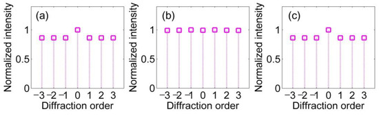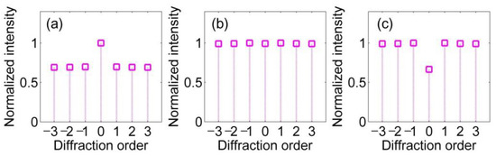 Before giving the proposed design method, we first analyze the influence of phase difference change on the output light field for the conventional 0-π DOE. Figure 1a is the phase distribution of a binary DOE used to generate the 3 × 7 spot array with equal intensity. Figure 1b–d are the output light fields obtained by performing two-dimensional Fourier transform operation of the phase distribution in Figure 1a with phase difference of π, 0.9π, and 1.1π, respectively. The insets in the bottom are the cross-section intensity distribution. It can be seen that the reconstructed 3 × 7 spots are very uniform when phase difference is π. Then, when phase difference is changed to 0.9π or 1.1π, the spots are no longer uniform, which is mainly because the zero-order intensity is significantly enhanced compared to other diffraction orders. However, it should be noted that the uniformity of other diffraction orders except the zero order is still very good, which means that the change in phase difference does not affect the uniformity of other diffraction orders. The above analysis indicates that the 0-π DOE has the following interesting properties: when the phase difference is varied from π to other values, the zero-order light intensity will be enhanced, and the uniformity of other diffraction orders can be retained.